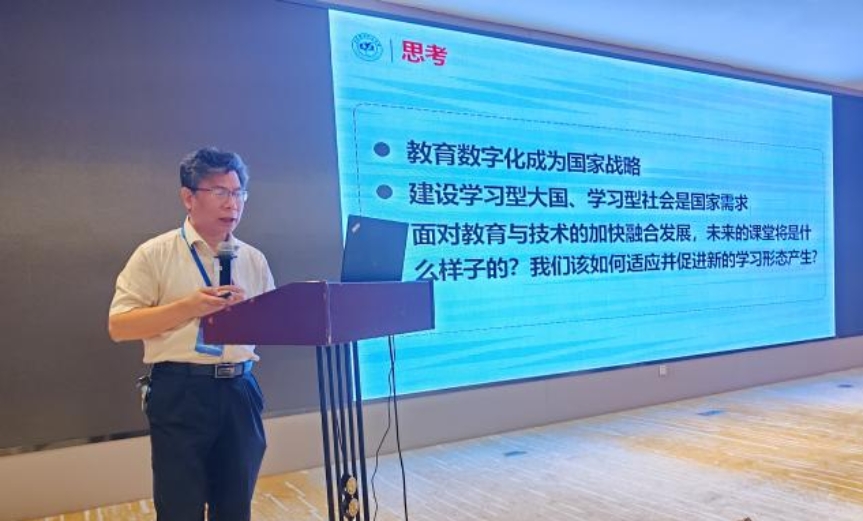 会议主题报告环节由哈尔滨工业大学尹逊波教授主持。首先北京航空航天大学高等理工学院曹庆华教授在题为《谈谈数字课程教材与学习空间建设》的报告中,从教育数字化建设新要求、数字课程教材建设新形态、未来学习空间建设构想进行展开,认为数字教材本质是教材,数字课程本质也是课程,利用数字技术打通“教、学、练、测、评、研、管”等教学环节,重构传统教学流程。教育数字化是国家战略,将快速促进学习科学发展。数字课程、数字教材将加速未来教与学变革,构建未来学习空间,推进学习型社会、学习型大国建设。