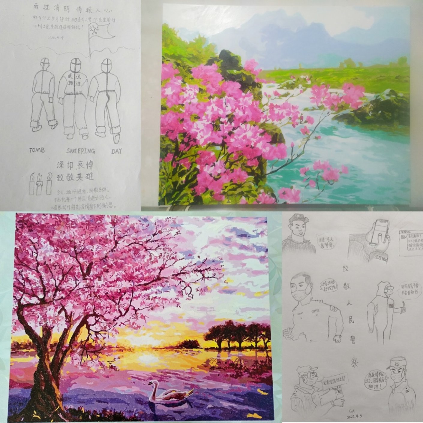 有老师分享了他的“飞鸟集”,有老师分享了燕园美景,有老师分享了在家练操的小绘画,有老师用手中的笔描绘了致敬战疫英雄们,有老师描绘了樱花已灿的图景……形式不一样,愿景一致,那就是愿春回大地后的祖国,山河无恙、人间皆安。