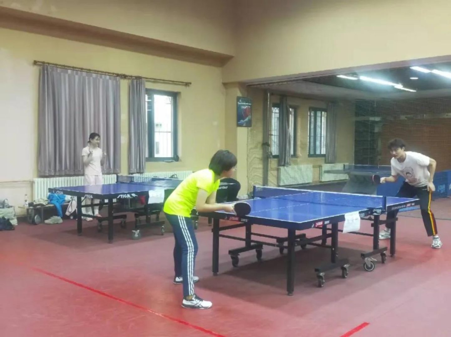 12月5日下午,乒乓球师生赛率先拉开帷幕。本次比赛共有33位选手参赛,其中有10名老师分配到9个小组中,那么由抽屉原理可知,必有一组存在两个老师,此组可称为“地狱”小组。地狱组中的高悦老师和杨静平老师横扫组内同学,入围十六强。小组赛后,共8名老师成功出线,入围十六强,与其他8名同学进行淘汰赛争夺八强名额。