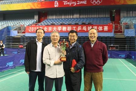 决赛中,数院一队的对手是校机关队。刘老师再次率先拿下一分,而蒋老师则遇到了对方选手的强力冲击,并最终不敌对手。关键的天王山之战中,戴波老师稳健发挥了自身水平,用一场胜利为数院一队占据了有利位置。紧接着,刘老师再次登场。面对之前击败蒋老师的对方年轻选手,刘老师充分发挥了经验上的优势,利用缜密的球路和旋转变化,最大程度地克制了对手抢冲抢拉的凶狠打法,并一举拿下对手,继去年决赛之后再次充当了终结者的角色。最后一球尘埃落定时,场边的数院队员和观众禁不住高声喝彩鼓掌。刘老师面带胜利的微笑,与队友们一一击掌庆祝。数学学院男团四冠王朝的一段传奇历史就此诞生!