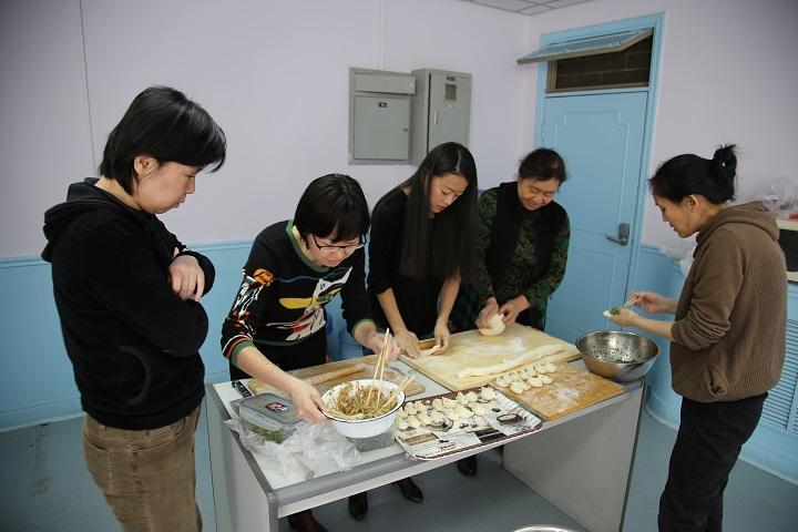 活动开始前两天,院工会将老师们分为4个组,每组设1名组长,组长负责安排本组的食材和工具。3月8日11点15分,大家兴奋地聚集在理科1号楼1384室,每组按照分工,有的和面、有的洗菜、有的切菜、有的拌馅,大家忙得不亦乐乎。饺子馅有猪肉酸菜、猪肉荠菜、猪肉韭菜、猪肉白菜、猪肉莲藕、胡萝卜三鲜等,琳琅满目的食材让人期待不已。面和饺子馅准备完毕后,每组负责擀皮和包饺子的女老师各就各位,干劲十足,擀皮和包饺子的速度超乎平常;不会包饺子的女老师就负责煮饺子;参与活动的男老师也纷纷动手帮忙擀皮、包饺子。大家围在桌子旁一边干活一边聊天,好像一家人一样其乐融融。活动中间还进行了擀皮比赛和包饺子比赛,欢声笑语不断传出。