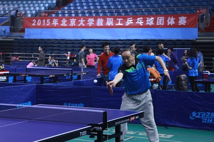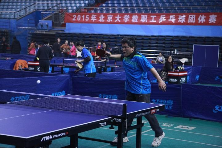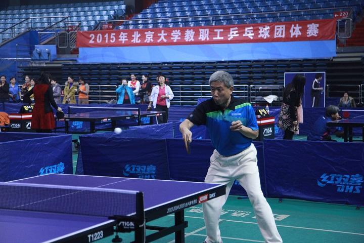 由于数院一队和二队同处下半区,八强赛晋级后被迫在半决赛中“同室操戈”。双方可谓知根知底,没有任何秘密可言。首盘蒋老师对杨老师,比分一直非常接近,杨老师在第一局中还一度拿到局点,但蒋老师水平还是更高一筹,以14:12和两个11:9获胜。次盘刘老师在对李老师的比赛中实力也明显占优,以11:8和两个11:7取胜。三单战,戴老师对王福正老师,双方球风截然相反,戴老师擅攻,王老师善守,双方远台争斗中大开大合,打得观赏性十足。不过戴老师的进攻之矛更加犀利,同样以3:0获得胜利,这样数院一队就连续六年杀进北京大学教职工乒乓球团体赛决赛。