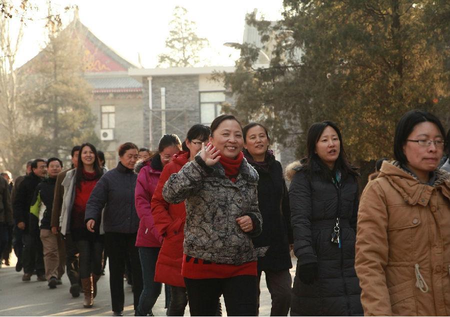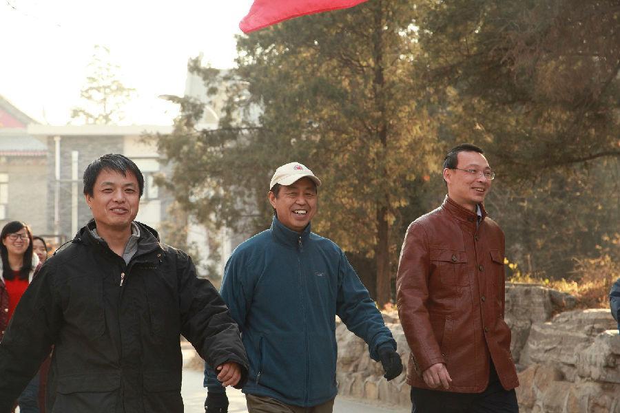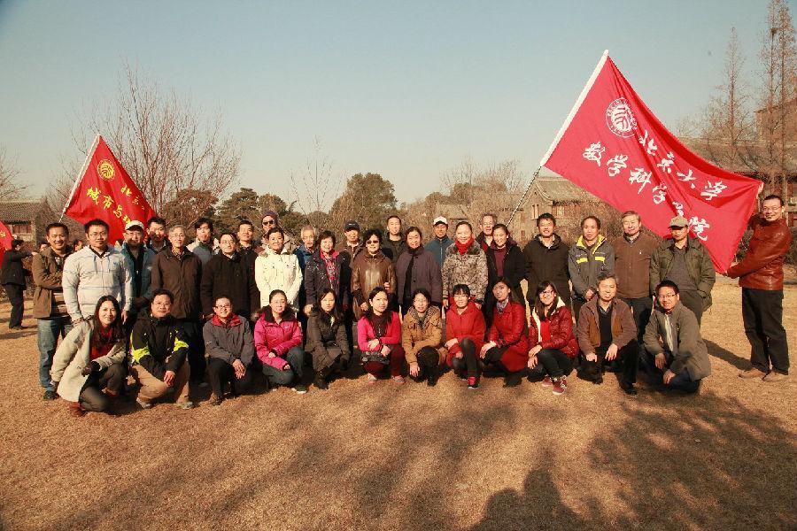 冬日中午的阳光慵懒地环绕着燕园万物,静静的未名湖温柔地荡漾着金色光辉。万里无云的天空,清冷新鲜的空气,都为老师们带来了好心情。在数学学院高扬的旗帜下,刘化荣书记、夏壁灿副院长、史宇光副院长和刘雨龙副书记走在队伍的最前列。数学学院的庞大阵容中既有年富力强的青年人,更不乏老当益壮的退休教工。从博雅塔到红一楼,自南北阁到二体,一路上老师们箭步如飞,欢声笑语不断。到达终点后,老师们在静园草坪上集体合影留念,为这次健步之旅画上了圆满的句点。