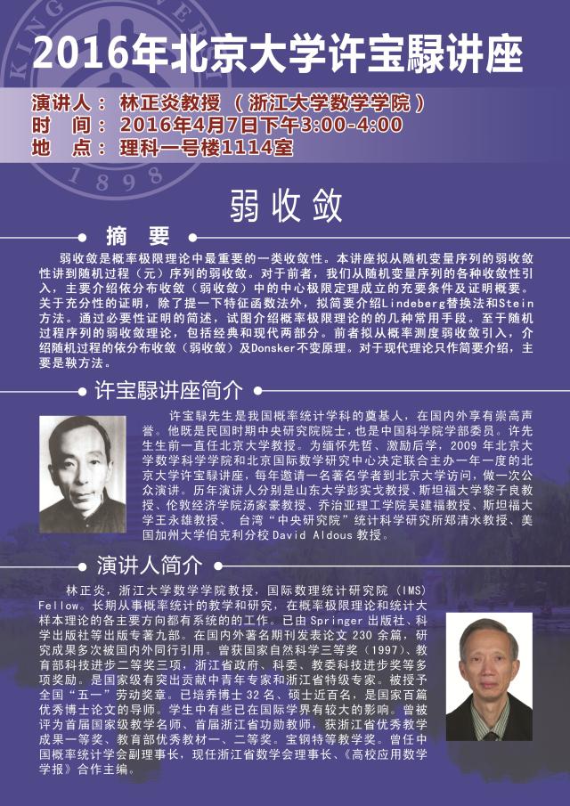 许宝騄讲座简介:许宝騄先生是我国概率统计学科的奠基人,在国内外享有崇高声誉。他既是民国时期中央研究院院士,也是中国科学院学部委员。许先生生前一直任北京大学教授。为缅怀先哲、激励后学,2009年北京大学数学科学学院和北京国际数学研究中心决定联合主办一年一度的北京大学许宝騄讲座,每年邀请一名著名学者到北京大学访问,做一次公众演讲。历年演讲人分别是山东大学彭实戈教授、斯坦福大学黎子良教授、伦敦经济学院汤家豪教授、乔治亚理工学院吴建福教授、斯坦福大学王永雄教授、 台湾“中央研究院”统计科学研究所郑清水教授、美国加州大学伯克利分校David Aldous教授。