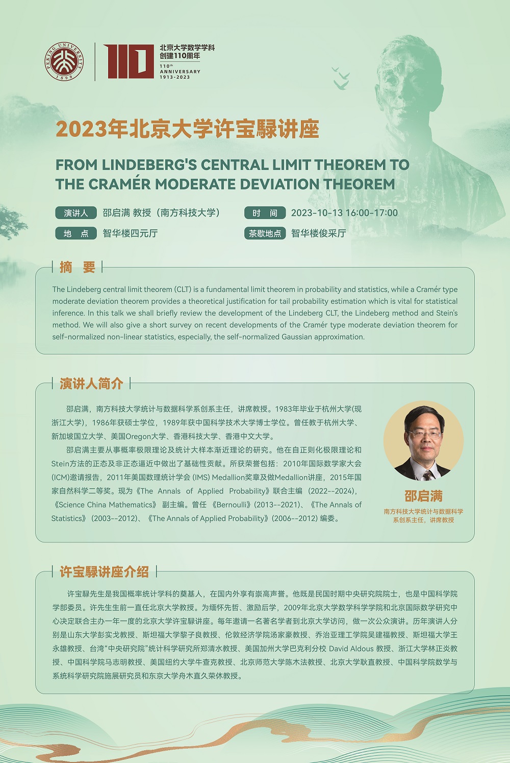 2023年北京大学许宝騄讲座——From Lindeberg's Central Limit Theorem to the Cramér Moderate Deviation Theorem