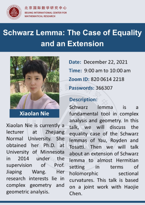 Xiaolan Nie is currently a lecturer at Zhejiang Normal University. She obtained her Ph.D. at University of Minnesota in 2014 under the supervision of Prof. Jiaping Wang. Her research interests lie in complex geometry and geometric analysis.