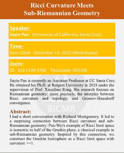 Speaker: Jiayin Pan is currently an Assistant Professor at UC Santa Cruz. He obtained his Ph.D. at Rutgers University in 2018 under the supervision of Prof. Xiaochun Rong. His research focuses on Riemannian geometry; more precisely, the interplay between Ricci curvature and topology, and Gromov-Hausdorff convergence.
