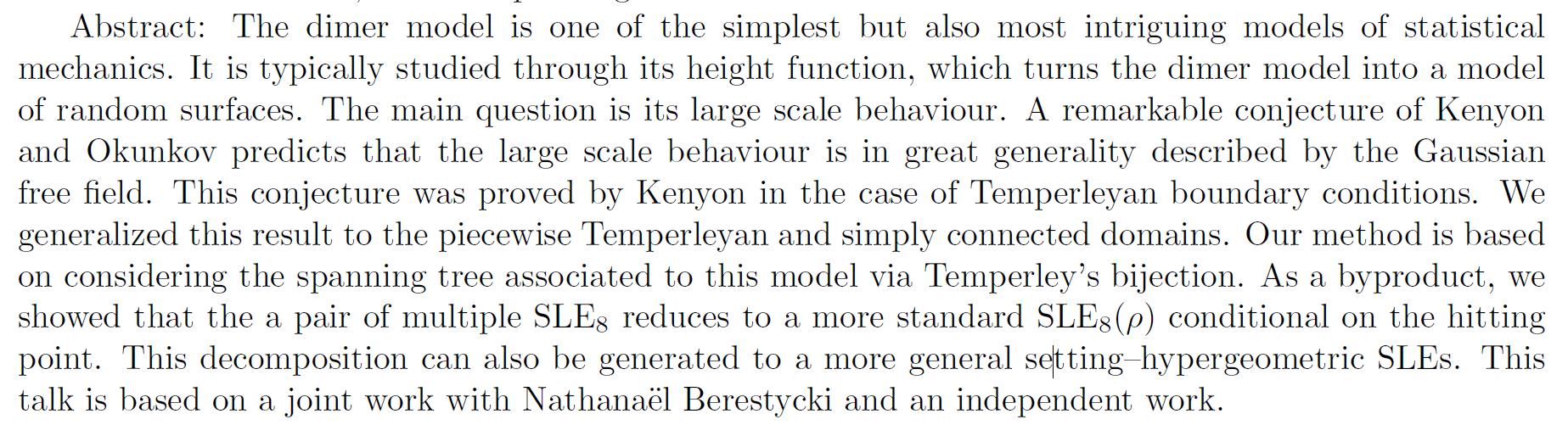Probability and Statistics Seminar——Dimer model, uniform spanning tree and Gaussian free field