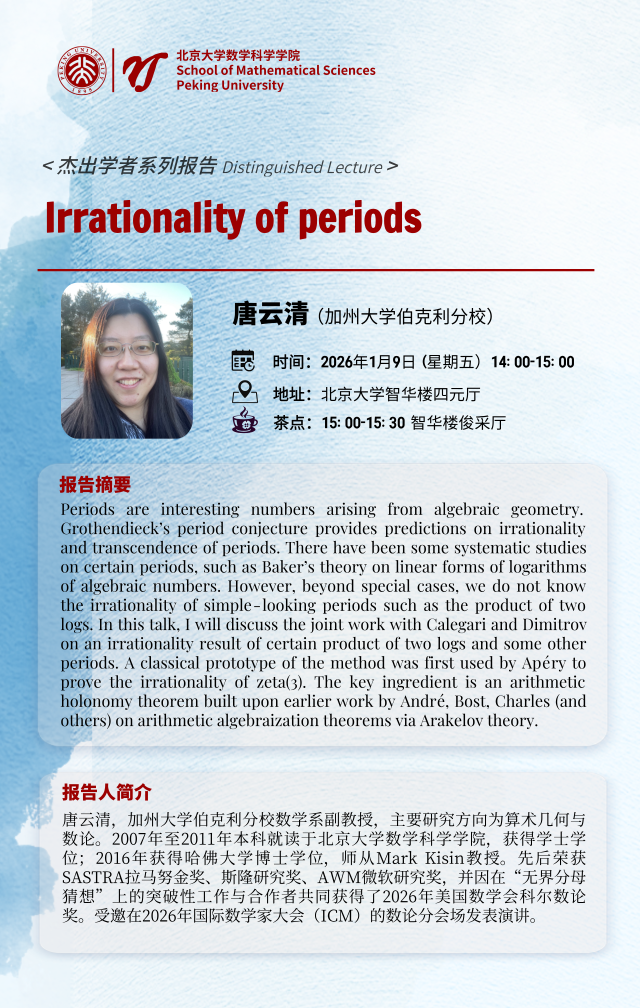 报告人介绍:唐云清,加州大学伯克利分校数学系副教授,主要研究方向为算术几何与数论。2007年至2011年本科就读于北京大学数学科学学院,获得学士学位;2016年获得哈佛大学博士学位,师从Mark Kisin教授。先后荣获SASTRA拉马努金奖、斯隆研究奖、AWM微软研究奖,并因在“无界分母猜想”上的突破性工作与合作者共同获得了2026年美国数学会科尔数论奖。受邀在2026年国际数学家大会(ICM)的数论分会场发表演讲。