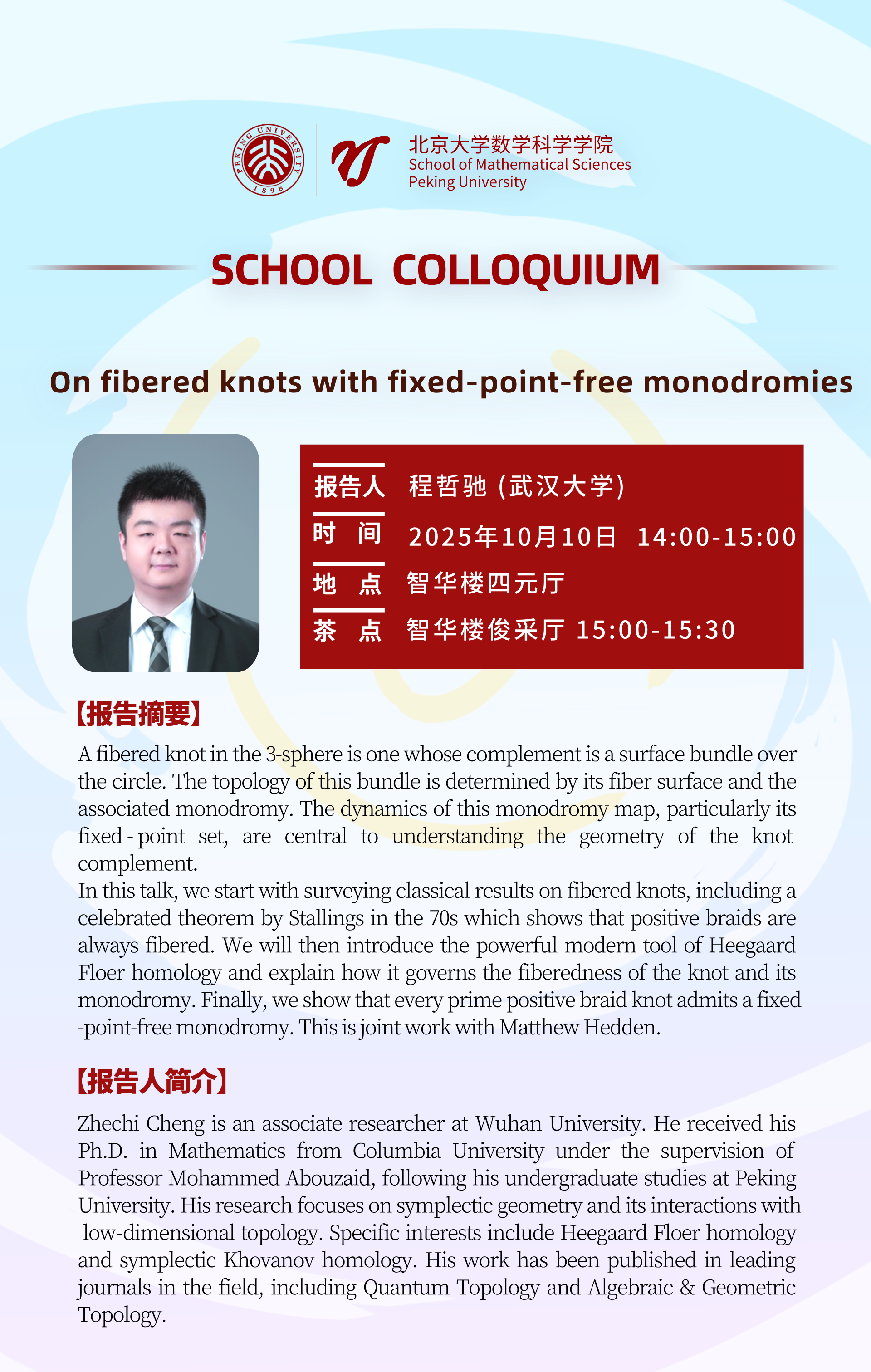 报告人简介:Zhechi Cheng is an associate researcher at Wuhan University. He received his Ph.D. in Mathematics from Columbia University under the supervision of Professor Mohammed Abouzaid, following his undergraduate studies at Peking University. His research focuses on symplectic geometry and its interactions with low-dimensional topology. Specific interests include Heegaard Floer homology and symplectic Khovanov homology. His work has been published in leading journals in the field, including Quantum Topology and Algebraic & Geometric Topology.