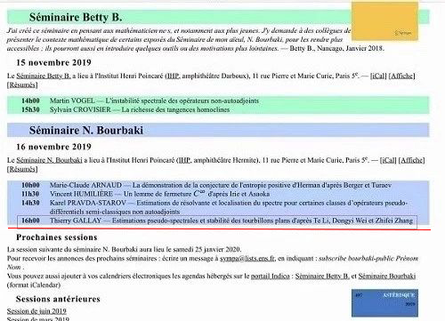 据巴黎高师官方发布的消息,世界闻名的布尔巴基讨论班(法语:Séminaire Nicolas Bourbaki)将于11月16日组织专题讨论班,讨论北京大学章志飞、韦东奕、李特的研究工作(章志飞为数学科学学院教授,韦东奕为国际数学研究中心博雅博士后,李特为数学科学学院在读博士)。