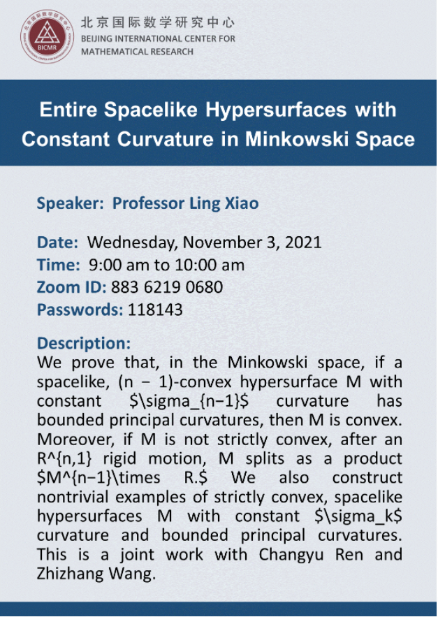 Abstract: We prove that, in the Minkowski space, if a spacelike, (n − 1)-convex hypersurface M with constant $\sigma_{n−1}$ curvature has bounded principal curvatures, then M is convex. Moreover, if M is not strictly convex, after an R^{n,1} rigid motion, M splits as a product $M^{n−1}\times R.$ We also construct nontrivial examples of strictly convex, spacelike hypersurfaces M with constant $\sigma_k$ curvature and bounded principal curvatures. This is a joint work with Changyu Ren and Zhizhang Wang.