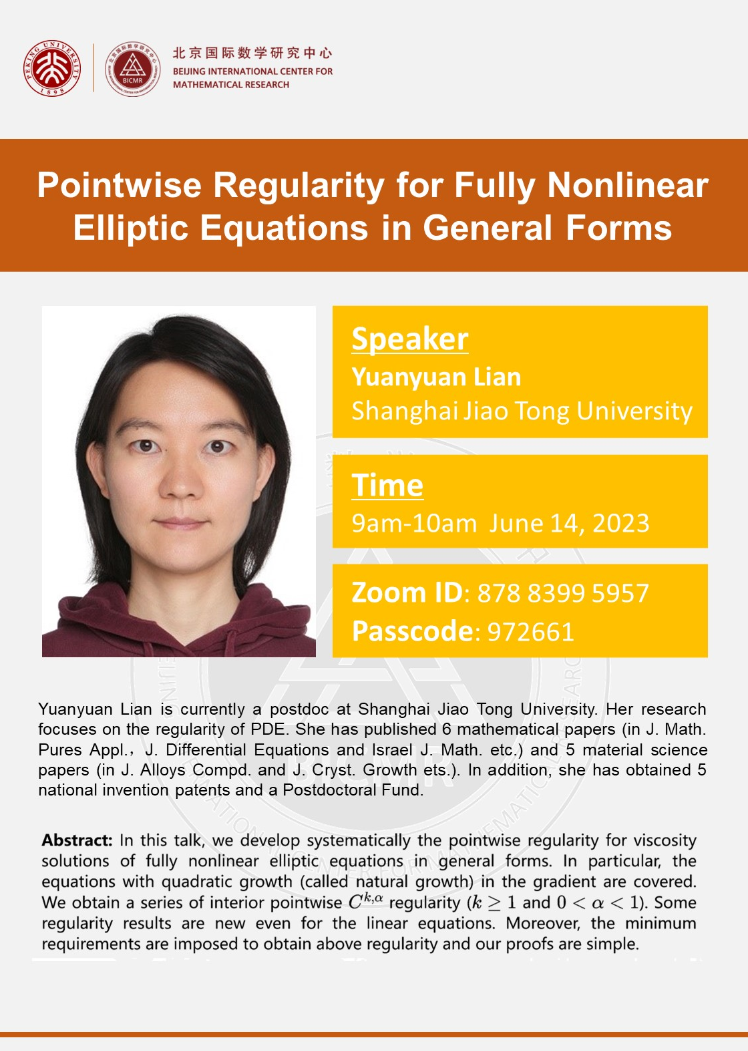 Speaker: Yuanyuan Lian is currently a postdoc at Shanghai Jiao Tong University. Her research focuses on the regularity of PDE. She has published 6 mathematical papers (in J. Math. Pures Appl.,J. Differential Equations and Israel J. Math. etc.) and 5 material science papers (in J. Alloys Compd. and J. Cryst. Growth ets.). In addition, she has obtained 5 national invention patents and a Postdoctoral Fund.