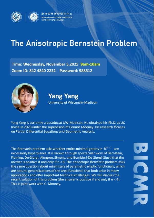 Yang Yang is currently a postdoc at UW-Madison. He obtained his Ph.D. at UC Irvine in 2023 under the supervision of Connor Mooney. His research focuses on Partial Differential Equations and Geometric Analysis.