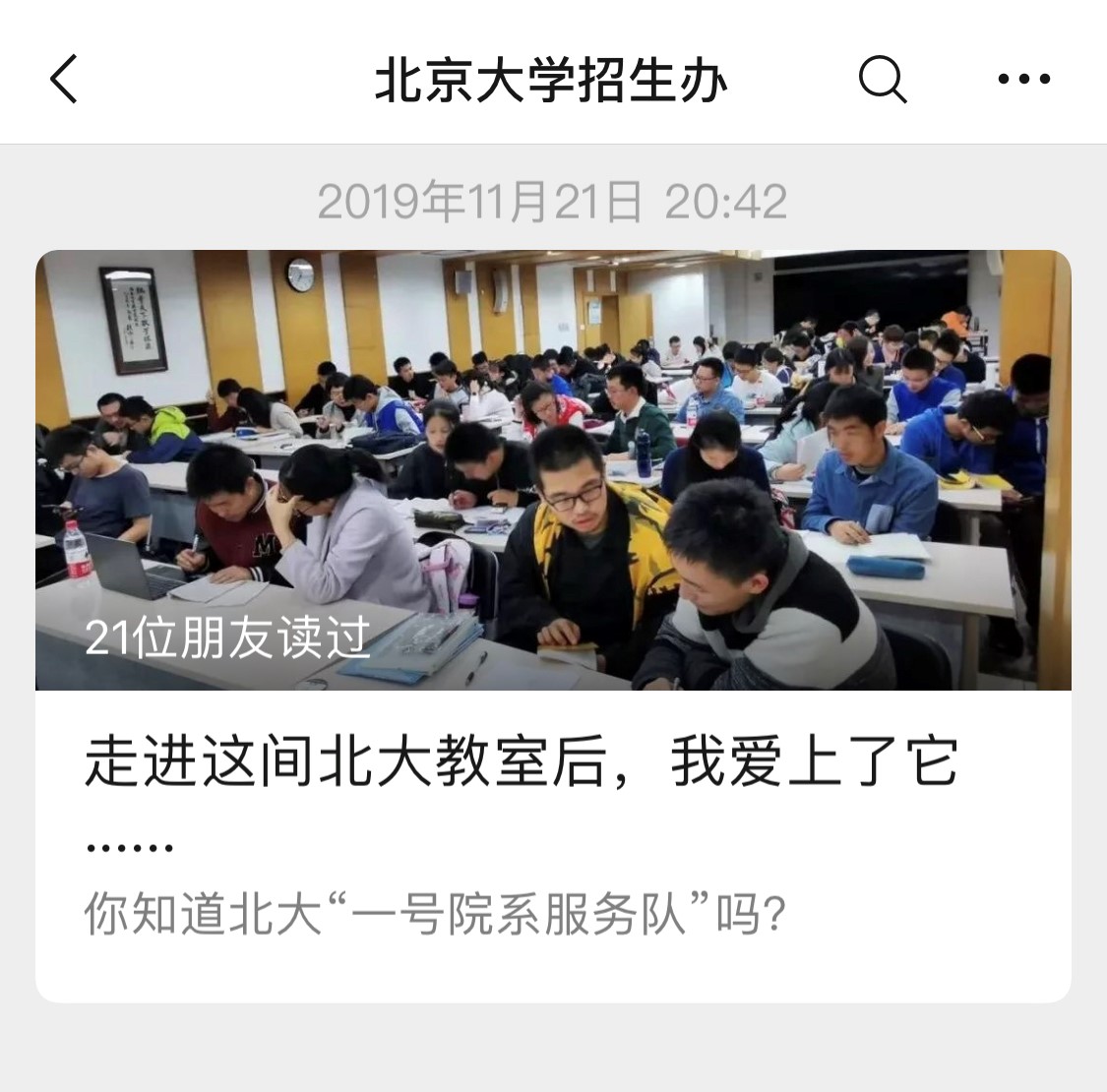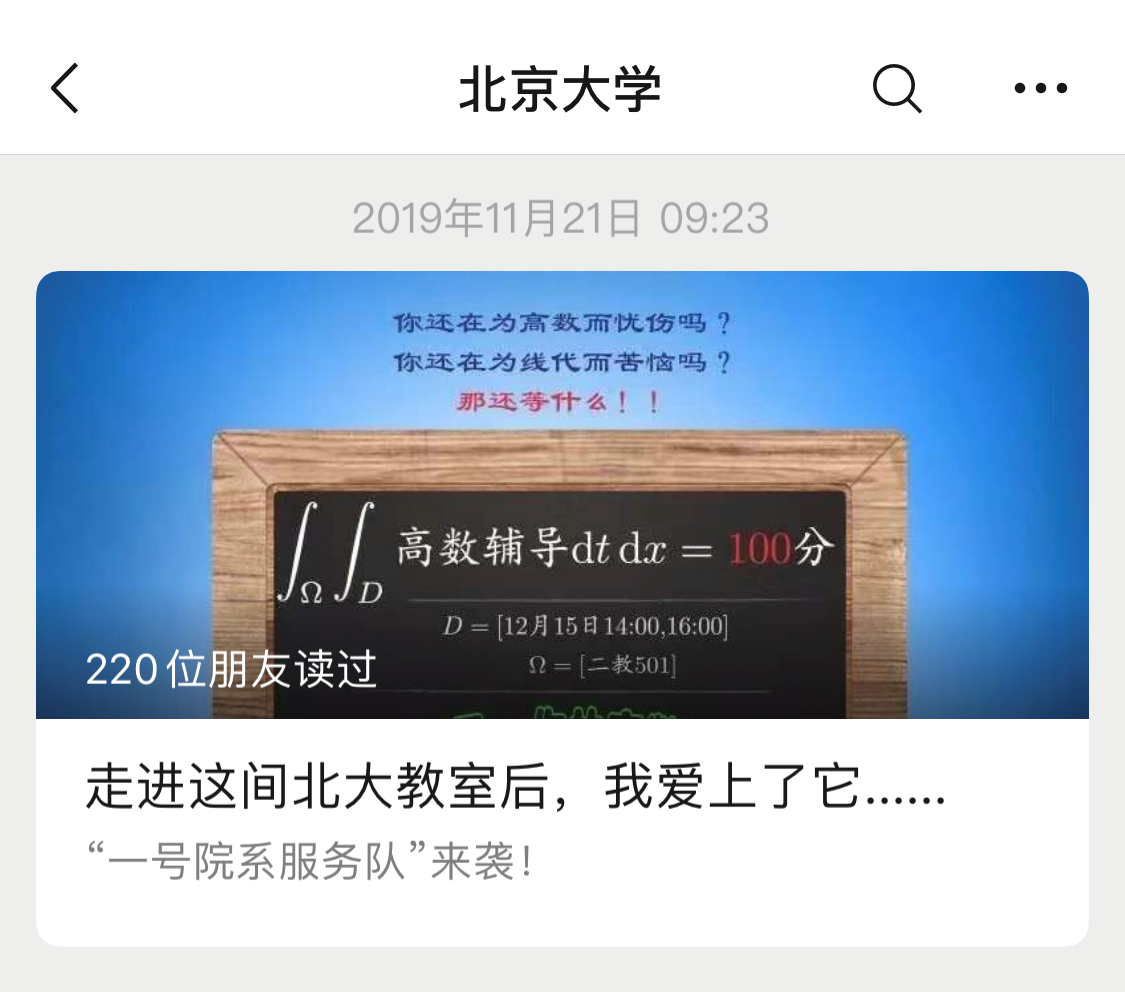 11月21日,经过半个多月的筹备协调,北京大学官方微信以《走进这间北大教室后,我爱上了它……》为题推送高数辅导宣传图文和视频,官方微博发布#北大高数辅导天团来袭#话题微博,抖音平台发布“在北大学高数,再也不用愁啦!”主题短视频。当晚,北京大学招生办微信公众号转载北大官微报道。11月25日起,北大团委微信平台、北京大学新闻网将目光从高数辅导项目聚焦至一号院系服务队,先后发布报道《“以数之名”再启程——记一号院系服务队》。