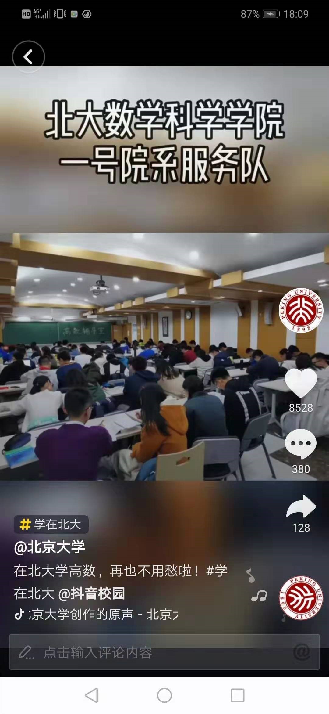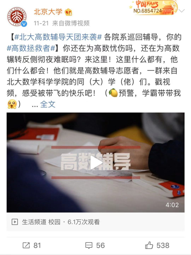 数学课系列辅导项目宣传效果显著。截至目前,北京大学官方微信相关阅读量4.6万,官方微博宣传视频播放6.1万次,官方抖音点赞8528次、评论380条、转发128条;北京大学招生办微信公众号转载阅读量6091。从上述平台的读者留言来看,评论积极,对学院学科建设、育人效果、学生工作颇多赞誉。