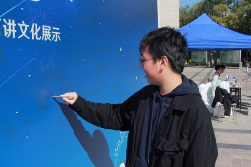 同学在签名墙上留下自己的名字