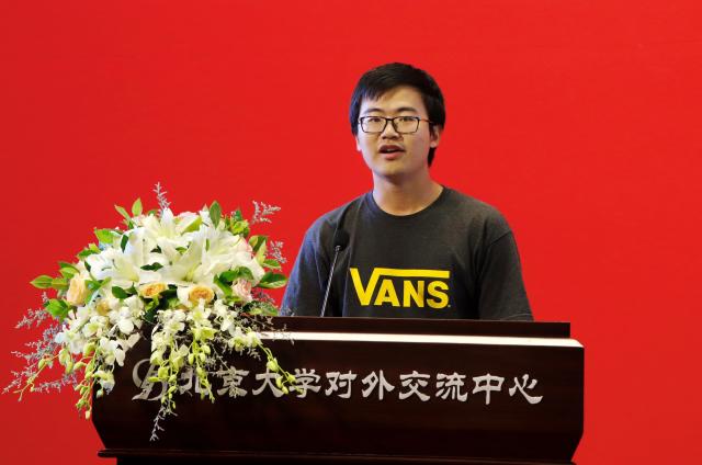 我是北京大学数学科学学院应用与计算数学系2016级本科生王逸轩。今天很荣幸能够作为老生代表,站在这里欢迎各位新生师兄师姐和学弟学妹们来到数院,在入秋的园子里开启生活新的旅行、续写同数学的邂逅故事。