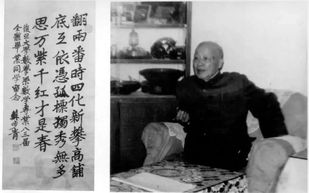 图为苏步青先生及所题诗词。诗中“翻两番时四化新”是指改革开放之初我国政府提出的奋斗目标,要在20世纪末实现工业、农业、科学技术和国防现代化,国民生产总值比1978年翻两番。