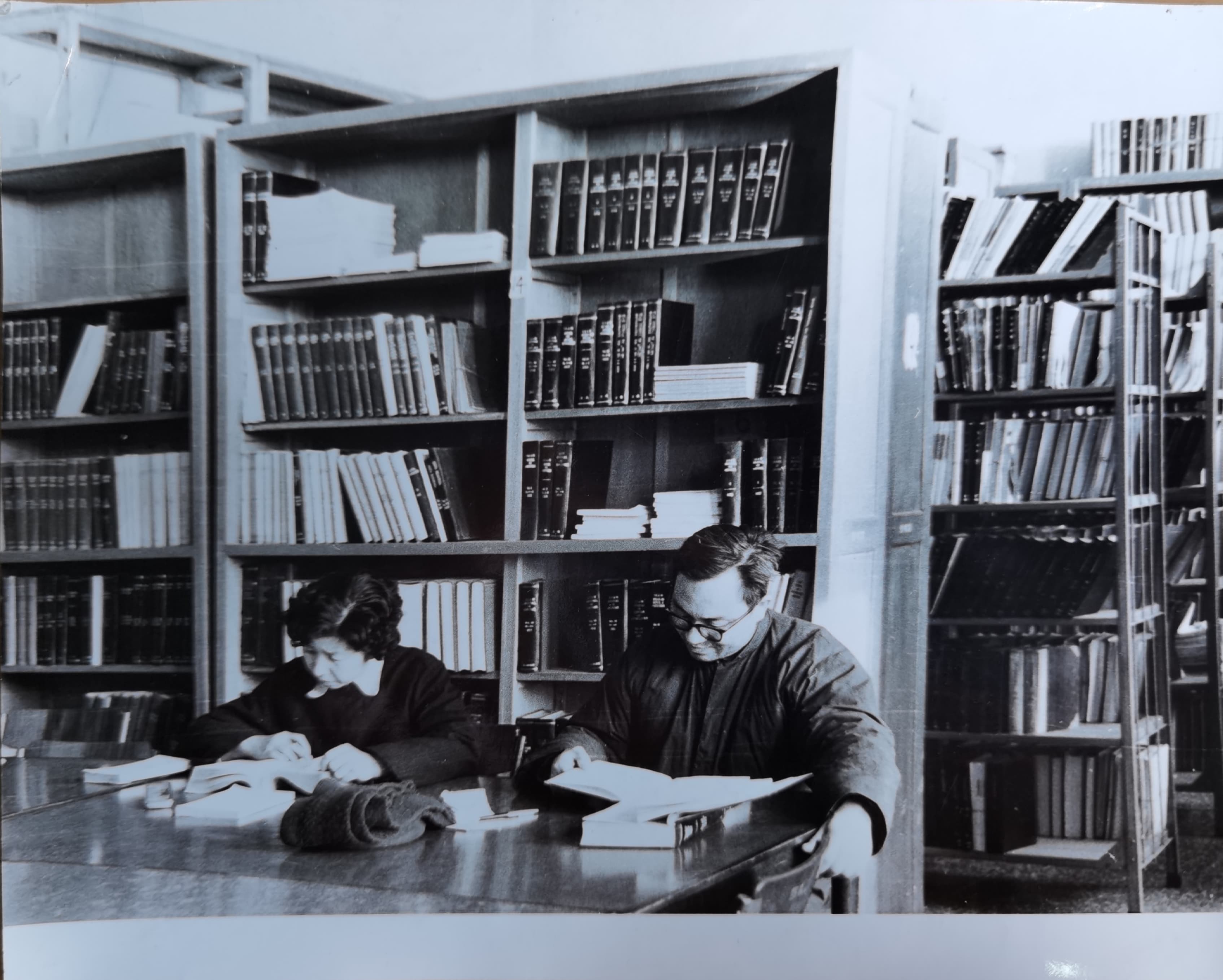 沈燮昌教授和叶抗生老师在北大图书馆第二阅览室中翻阅资料