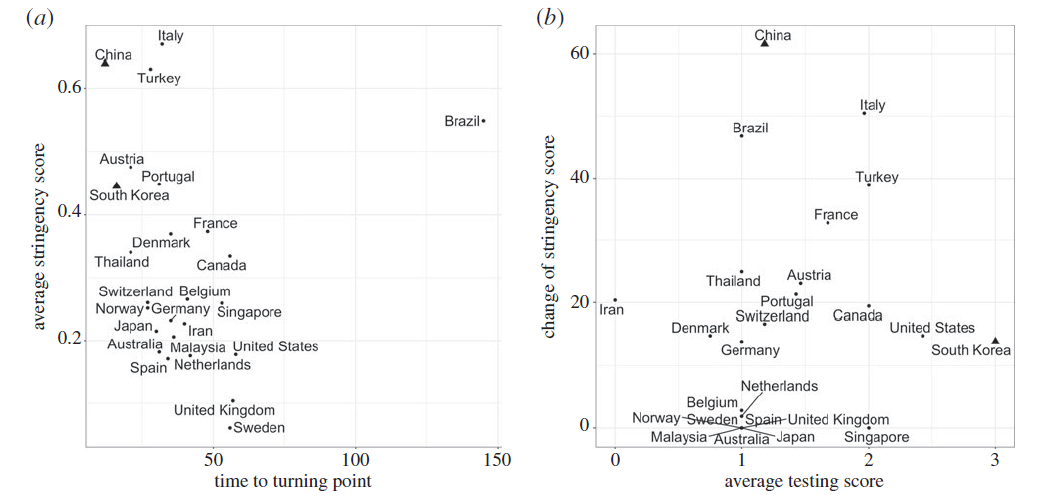 图3 (a)本地传播开始的2周内的平均人群限制性政策指数与第一波疫情到达拐点的时间的散点图;(b)本地传播开始的4周内的平均检测指数与本地传播的前后5天的平均人群限制性政策指数的变化的散点图。在除去异常值巴西后,(a)中的相关系数为-0.557(p值0.002)。用三角形标记出的为中国和韩国。
