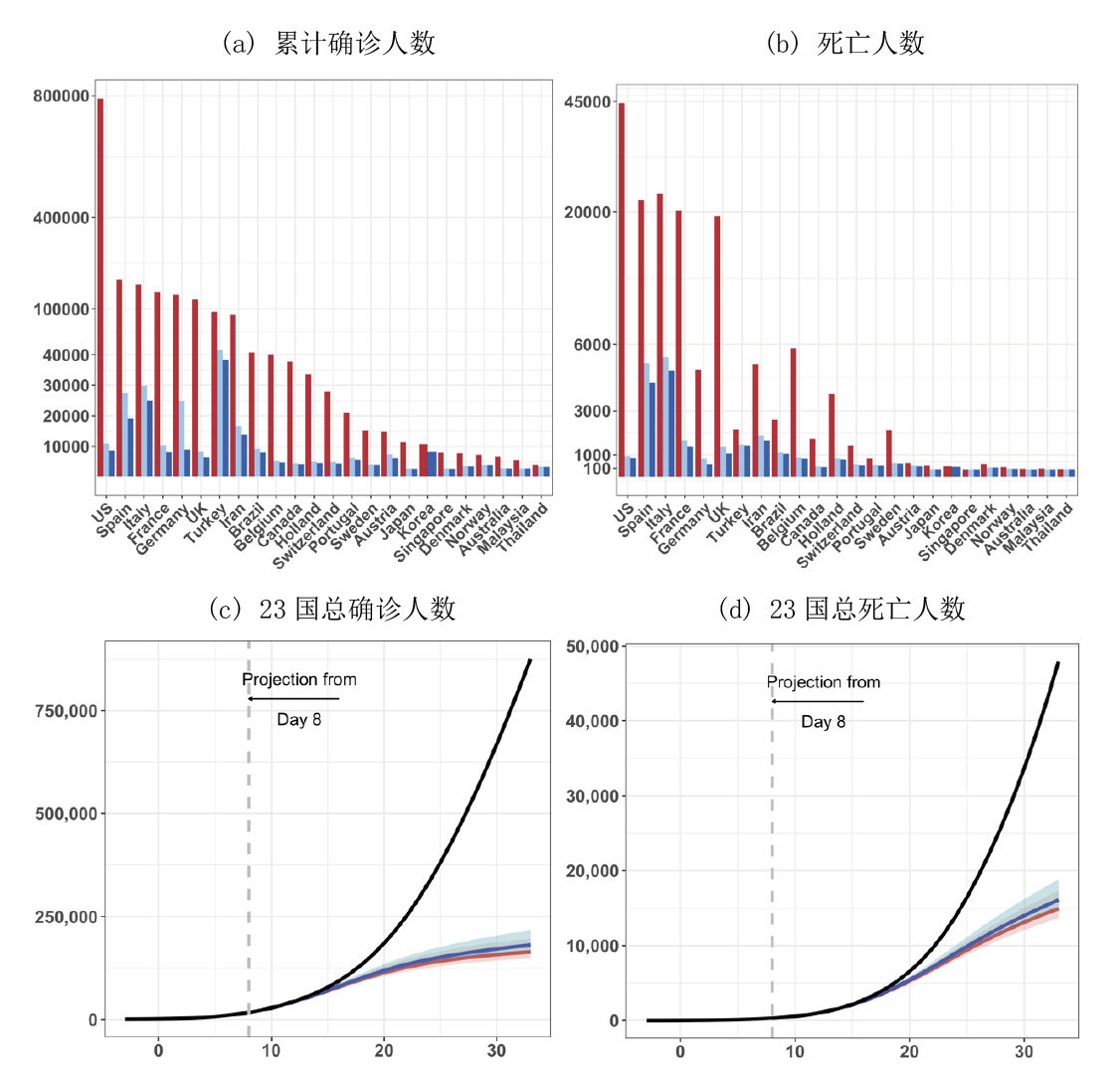 图4 非中国、韩国 23国从本地传播开始后第8天到2020年4月20日(第一波疫情),在中国(蓝色)和韩国(浅蓝色)的管控情景下及实际观测到的(红色)23个国家的确诊病例(a)和死亡(b)人数;在中国(红色)和韩国(蓝色)的情景下及实际观测到的(黑色)23个国家(不包括中韩两国)从本地传播的第8天到第33天的总确诊病例数(c)和总死亡人数(d)
