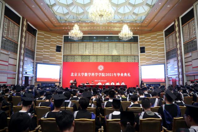 北京大学数学科学学院2021年毕业典礼于2021年7月12日13:30在北京大学英杰交流中心阳光厅隆重举行。典礼设置了2个直播分会场,毕业生家人同步观礼。北京大学数学科学学院院长陈大岳,党委书记胡俊,副院长史宇光、李若,党委副书记、副院长孙赵君,北京国际数学研究中心长聘副教授董彬,2002级数院校友、宾夕法尼亚大学统计与数据科学系教授丁剑等出席典礼。2021届本、硕、博毕业生和他们的家人近500人参加了毕业典礼。典礼由院党委副书记董子静主持。