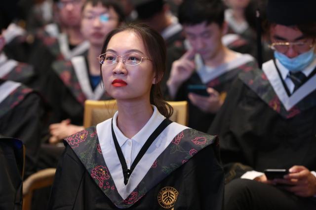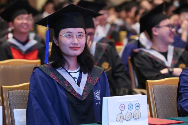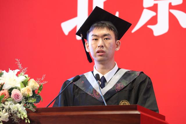 毕业生代表发言环节,本科生代表2017级本科生任一诺讲述了自己在北大数院成长的心路历程,提到数学隐藏着无限的可能,未来也蕴含着无限的可能性,希望同学们以更加直观而立体的思维来剖析问题,以更加理性而自信的心态去应对挑战。