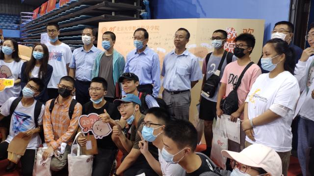 六点半,随着第一位新生的到来,迎新工作正式开始。新同学在工作人员的细心提醒和引导下,核对信息、系统注册、领取材料,完成报到流程。每一位新同学都在合影板前签字、留影,留下了初入北大、初识学院的专属记忆。