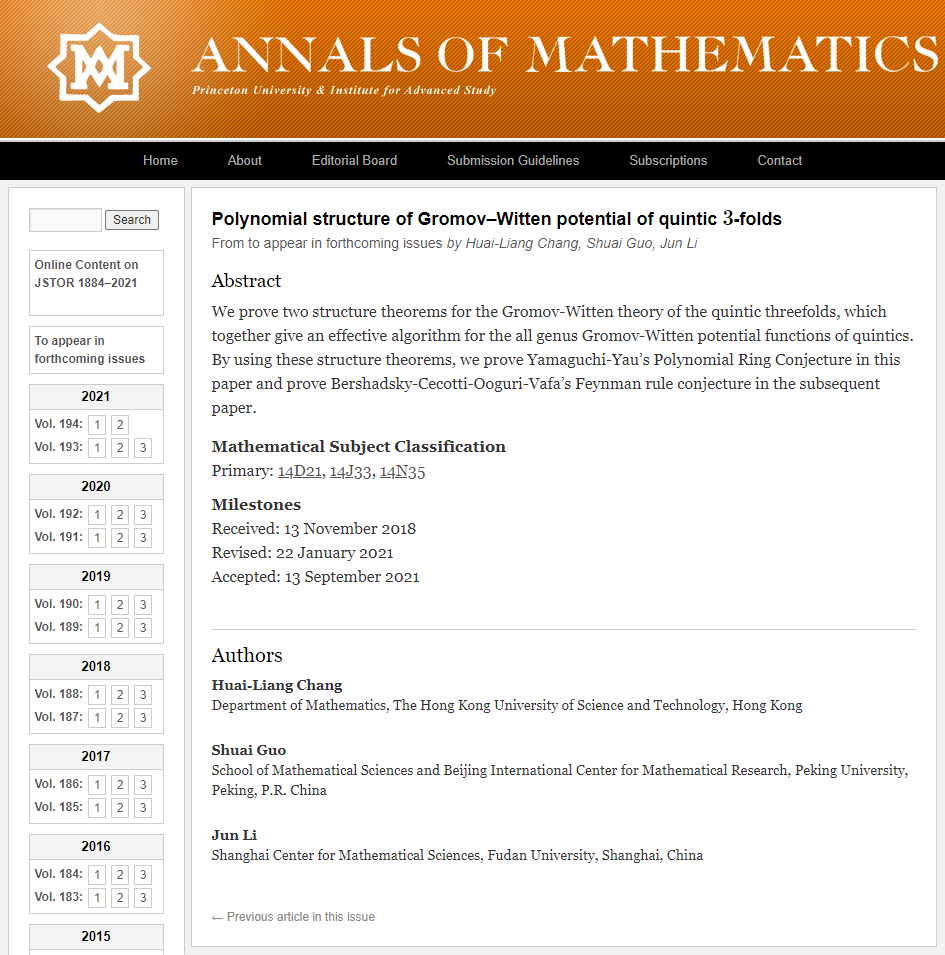 近日,北京大学数学科学学院郭帅副教授与人合作在BCOV理论的A-模型结构方面取得重要突破。其论文“Polynomial Structure of Gromov–Witten Potential of Quintic 3-folds(五次三维流形的Gromov-Witten势函数的多项式结构)”被国际顶尖数学期刊Annals of Mathematics接收。