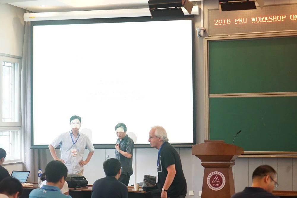 2016年8月董彬老师在数学中心组织国际会议“PKU Workshop On Mathematics in Imaging Science and Data Analysis”,照片是会议第一天,报告即将开始时的情景,图中左一为董彬老师,中间是董老师的硕士导师沈佐伟教授,右为董彬老师的博士导师Stanley Osher