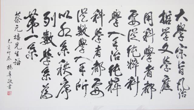 2019年6月17日,一幅气势恢宏的书法佳作在北京大学数学科学学院理科一号楼1114房间悬挂落成。这是我国当代著名美学家、书法家、北京大学哲学系教授杨辛先生向学院捐赠的书法作品,杨辛先生挥毫抄录了蔡元培老校长关于列数学系为第一系的论述——“大学宗旨,凡治哲学文学应用科学者,都要从纯粹科学入手;治纯粹科学者,都要从数学入手,所以各系秩序,列数学系为第一系。”