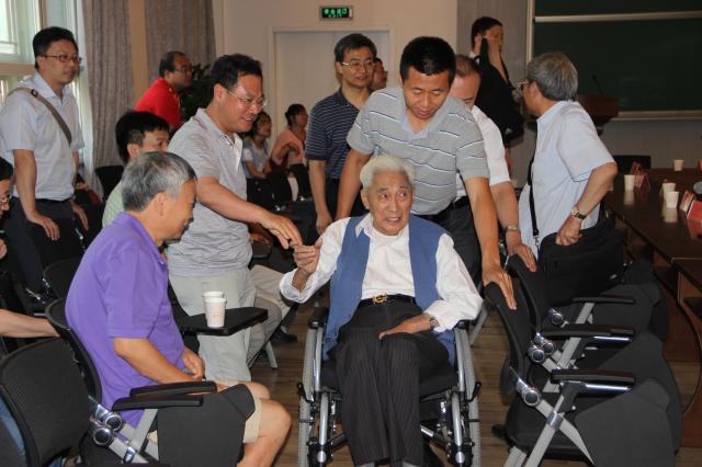 2014年丁石孙参加纪念段学复先生诞辰100周年活动,图为会后丁先生同与会者道别