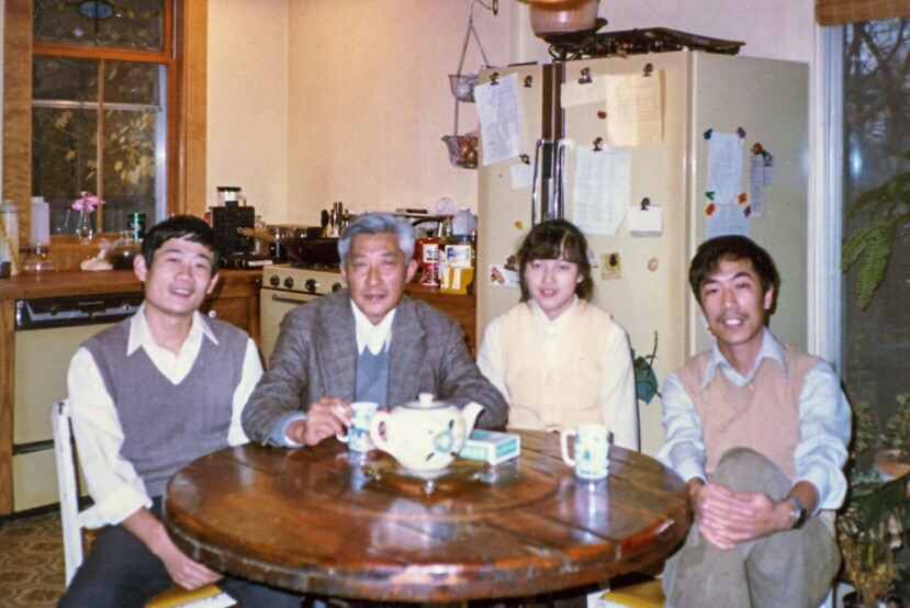 左起:涂某(美国东北大学研究生)、丁石孙先生、吴学宁(东北大学研究生、北京大学物理系1977级本科生)、吴宪(哈佛大学Griffiths教授的研究生)